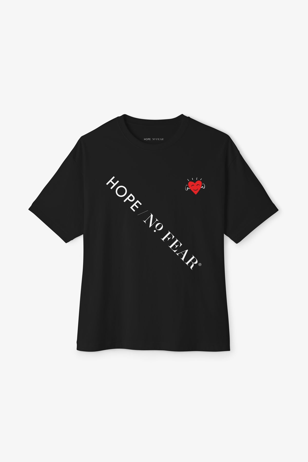 An oversized, relaxed tee that speaks softly but confidently. The black boxy silhouette drapes with casual ease while a small red heart emblem at the chest and diagonal “HOPE NO FEAR” lettering add quiet defiance and warmth. Wear it on slow mornings with coffee or layered under a jacket for late-night walks. The heavier medium-weight cotton feels grounded against the skin and the dropped shoulders let you move without fuss. This tee lives in the moments between routines — comforting, resilient, and quietly bold.